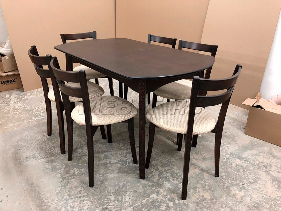 Недорогой комплект из натурального дерева. Стол+6 стульев. Современный надежный комплект для вашего дома или кабинета. Можно использовать в гостиных, кухнях, столовых, а также ресторанах и кафе.